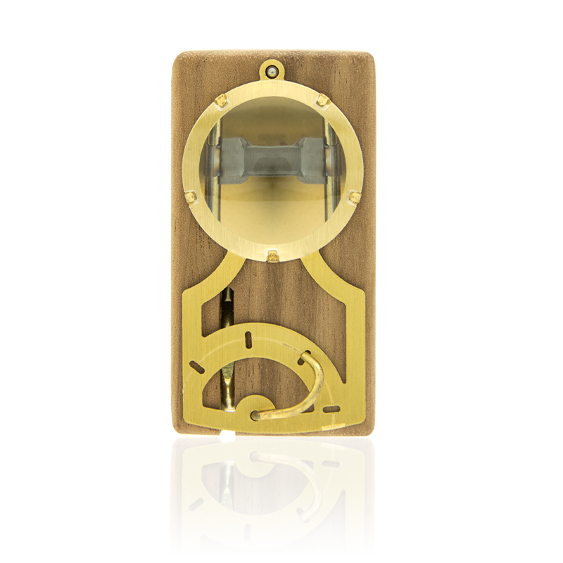 The Muad-Dib features an elegant brushed brass face and an optical grade glass lens with four snick locks to keep it held in place. In true Magic-Flight fashion, a new aphorism, Intimacy implies loyalty has been etched into the back of the box.