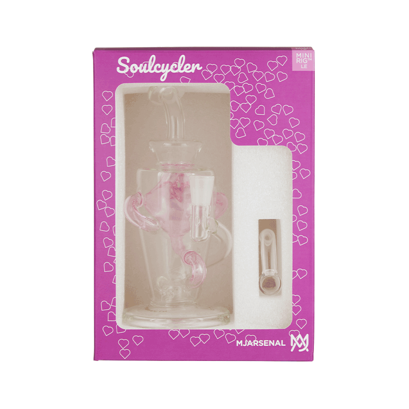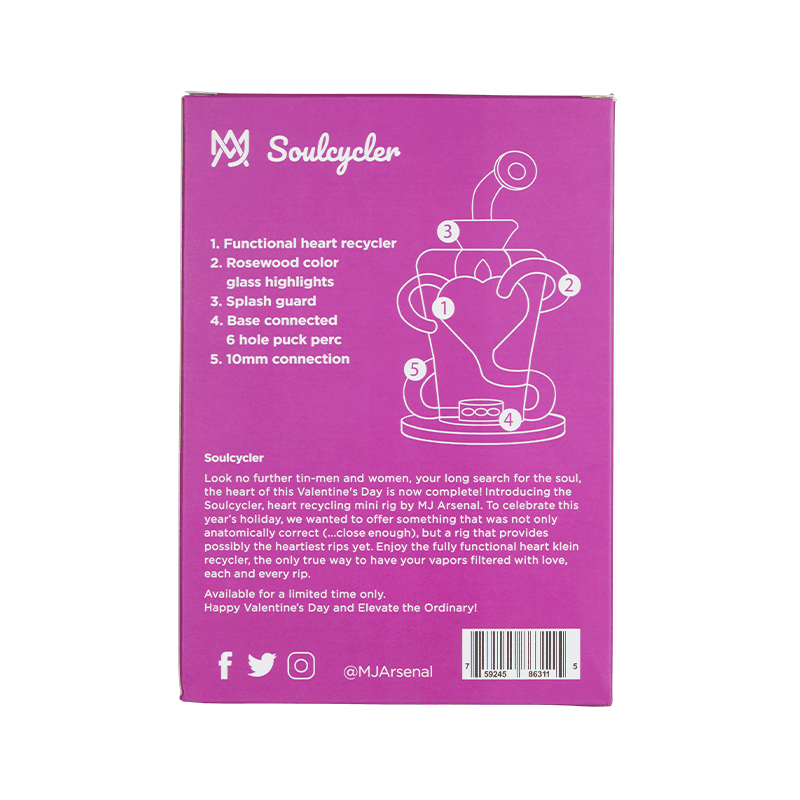 The Soulcycler Mini Rig™ is the latest limited edition Valentine’s Day offering from MJ Arsenal. With an anatomically correct (well, basically correct) design, a heart klein recycler pulls your vapor through moisture to ensure cool and smooth draws. The petite size of the Soulcycler Mini Dab Rig condenses your vapor during draws to unleash the full flavor of your concentrate. A 100% quartz banger is included to help with flavor facilitation.
