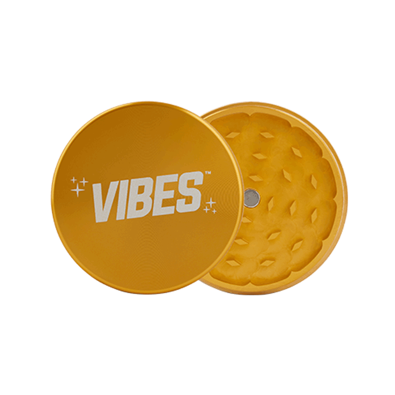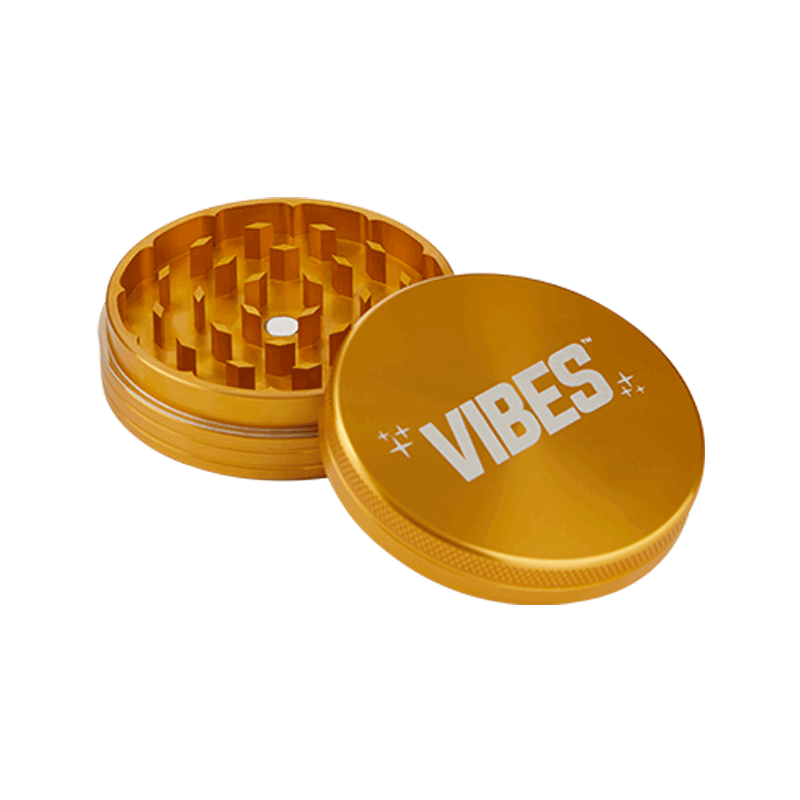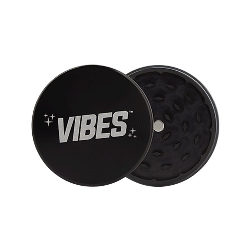The lightweight Vibes™ 2-Piece Grinder is milled from 6061 aircraft-grade aluminum and features an anodized finish to prevent flaking. The grinder’s 30 razor-sharp, diamond-shaped teeth finely shred dry herb to an even consistency.